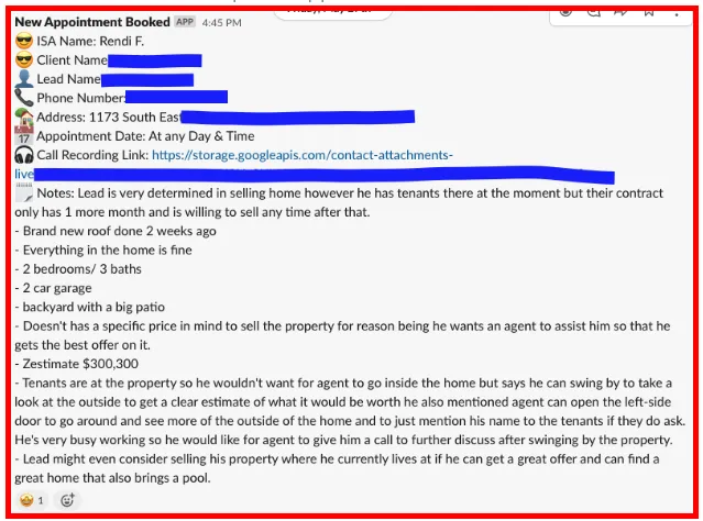 We have spoken to these leads and they are interested in hearing what you have to say. We set these appointments so you can meet them in person by their property, give them a home evaluation and get the conversation started. There are a few instances when people want to talk to you first before meeting you or they are out of town etc. In those cases, you could call them first and build a rapport and take the next steps. These are just the way you'd set appointments if you were prospecting yourself! Here are some examples of appointments we have sent.